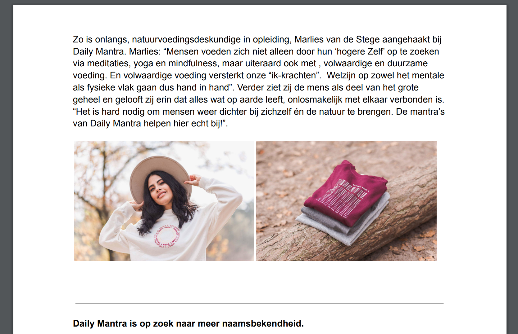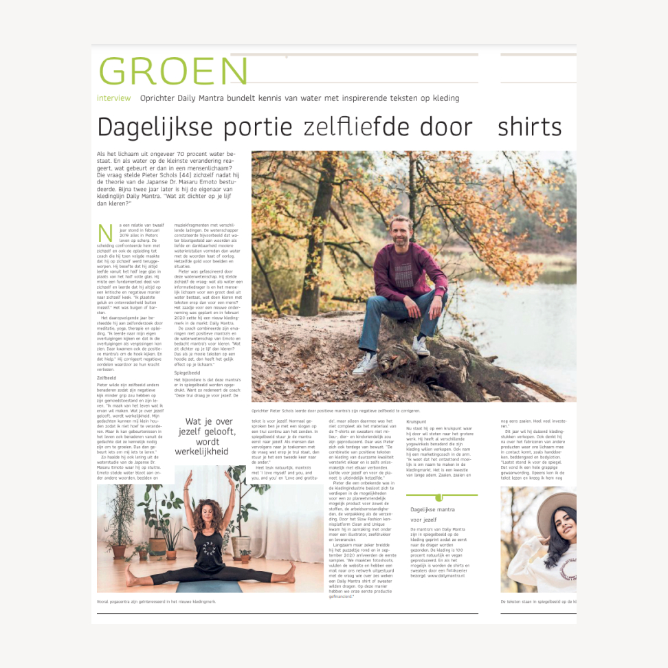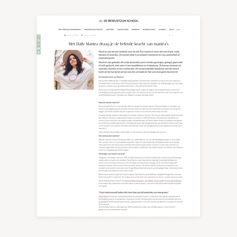 Daily Mantra nodigt je uit om te ontdekken hoe je jezelf en de wereld om je heen kunt voeden met datgene waar jij in gelooft. Niet alleen door jezelf te inspireren met positieve mantra’s, maar ook door het dragen van duurzame kleding met impact. Wat de kleding extra bijzonder maakt: de mantra’s staan in spiegelbeeld afgebeeld.